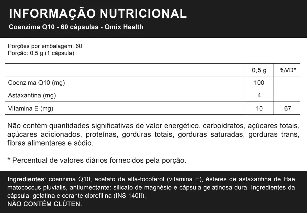 - Informação nutricional: porção 0,5 g (1 cápsula). Conezima Q10 100 mg (%VD*), Astaxantina 4 mg (%VD*), Vitamina E 10 mg (67% do VD*).