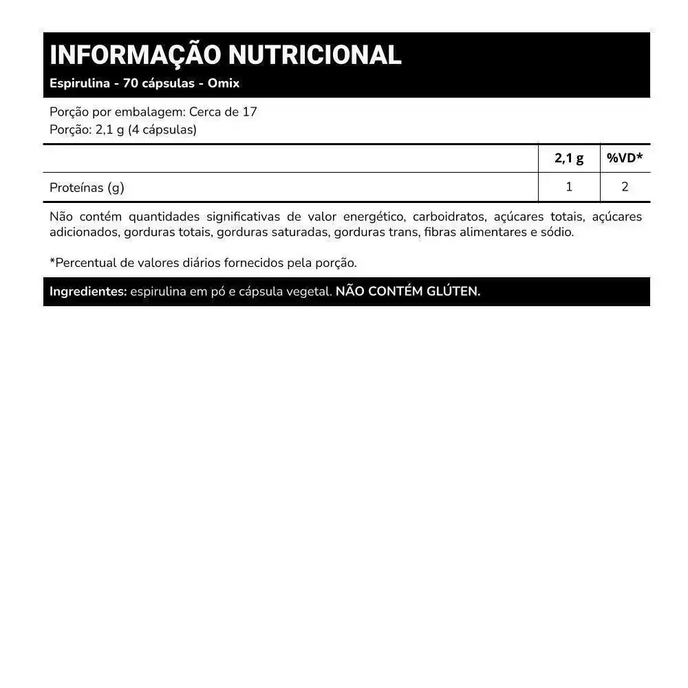 - Ingredientes: espirulina em pó e cápsula vegetal.