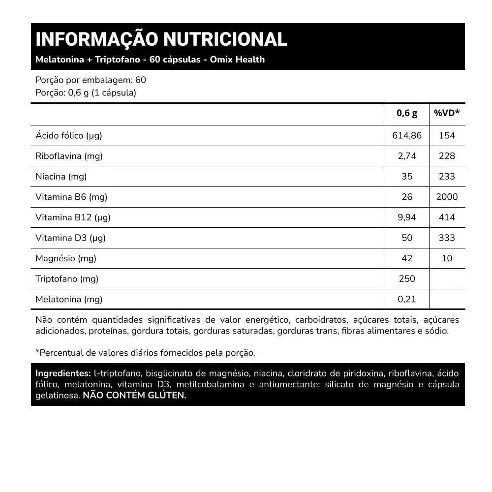 - Ingredientes: l-triptofano, bisglicinato de magnésio, niacina, cloridrato de piridoxina, riboflavina, ácido fólico, melatonina, vitamina D3, metilcobalamina, antiumectante silicato de magnésio e cápsula gelatinosa. NÃO CONTÉM GLÚTEN. Ingredientes da cápsula: gelatina e corantes clorofilina (INS 140II).