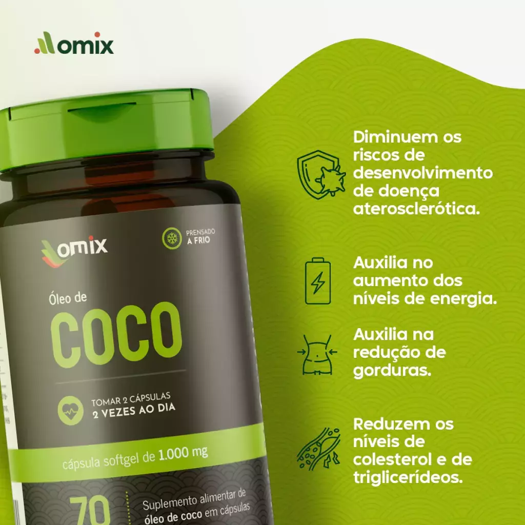 O Óleo de Coco em cápsulas da Omix é um suplemento natural que fornece uma fonte concentrada de gorduras saudáveis, ideal para complementar a alimentação diária. Cada cápsula contém 1g de óleo de coco extra virgem, que é uma excelente fonte de ácidos graxos essenciais.