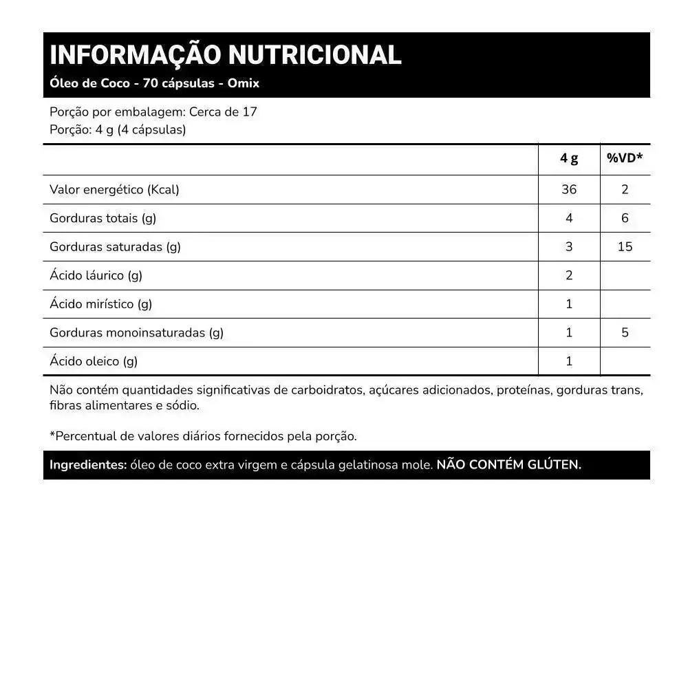 - Informação nutricional: Porção de 4 g (4 cápsulas): Valor energético 36 Kcal (2% do VD*), Gorduras totais 4 g (6% do VD*), Gorduras saturadas 3 g (15% do VD*) Ácido láurico 2 g (%VD), ácido mirístico 1 g (%VD), Gorduras monoinsaturadas 1 g (5% do VD*), Ácido oleico 1 g (%VD).