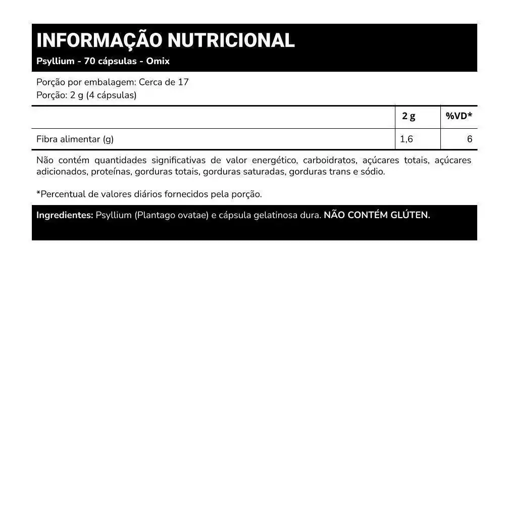 - Ingredientes: Psyllium (Plantago ovatae) e cápsula gelatinosa dura