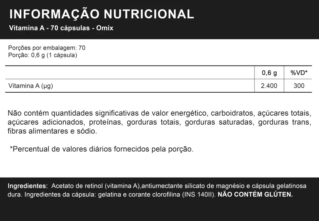 - Ingredientes: vitamina A, antiumectante: silicato de magnésio e cápsula gelatina dura. NÃO CONTÉM GLÚTEN.
