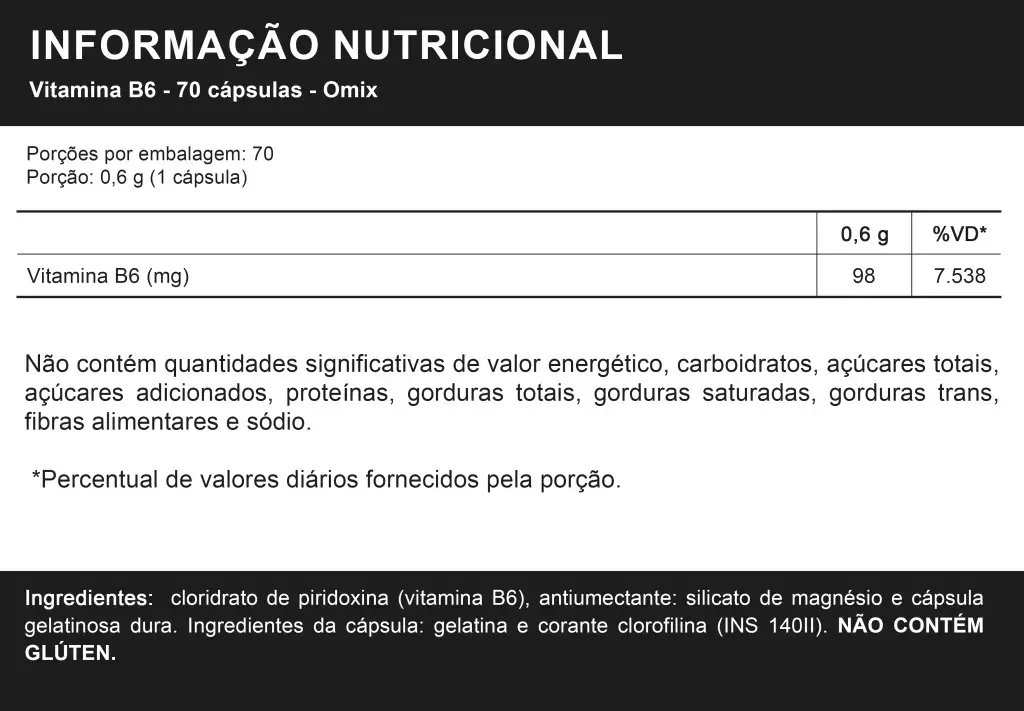 Informação nutricional: Porção de 565 mg (1 cápsula): Vitamina B6 98 mg (7585% do VD*).